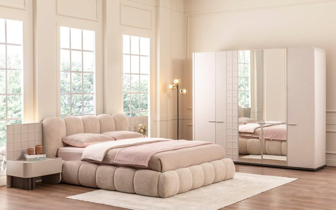 Lorena Komodin; nötr ve açık gri tonlarıyla sadeliği yansıtırken, ahşabın renk tonları ve güçlü formuyla yatak başında tamamlayıcı bir görünüm sunar.