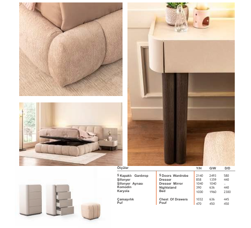 Lorena’nın yalın çizgilerini takip eden şifonyer; yatak odanızda hem estetik hem de düzenli bir kullanım alanı oluşturmaya yardımcı olur, ferah ve dengeli görünümü destekler.