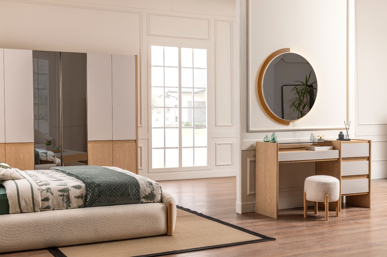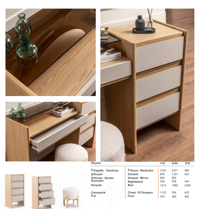 Minimal çizgisi ve kullanışlı depolama yaklaşımıyla günlük eşyalarınızı toparlar; Natura’nın dingin karakterini yatak odanızın düzenine taşır.