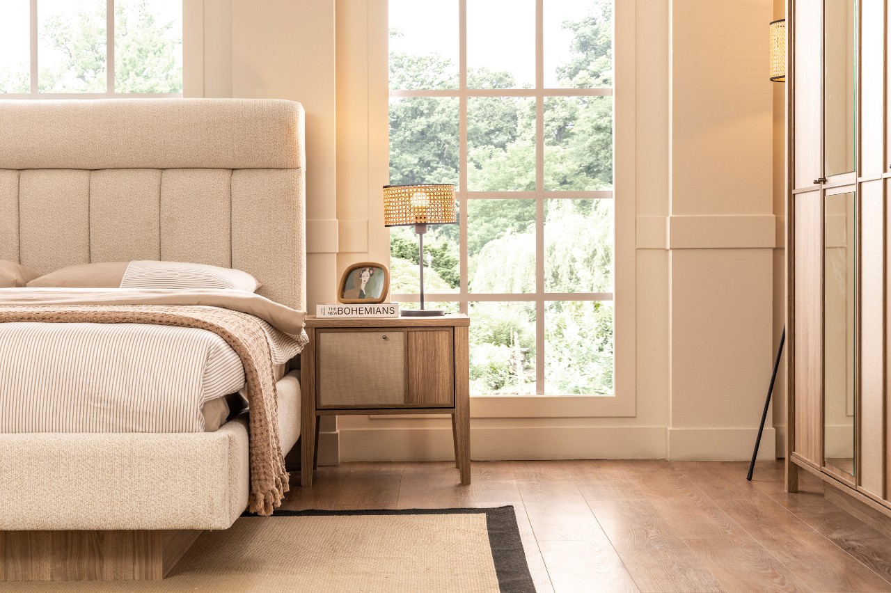 Ahşabın dokusunu ve tekstilin sıcak hissini yatak başına taşır; sade bir dengeyle alanın atmosferini tamamlar.